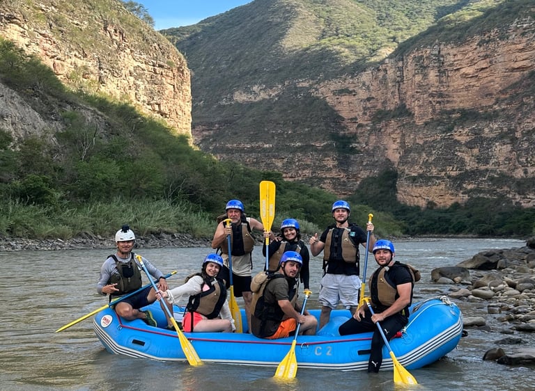 Descubre una de las experiencias más emocionantes de Santander con el rafting en el Cañón del Chicamocha. Desciende por las aguas bravas del río Chicamocha mientras disfrutas de paisajes imponentes, rápidos llenos de emoción y una aventura segura guiada por expertos.
